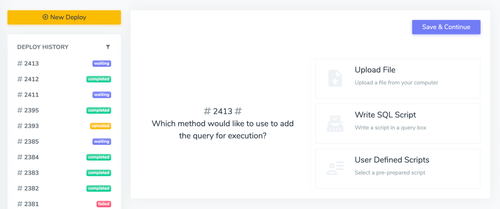 From this page, you can directly upload the queries you want to run, write them using an online text editor, or complete the file upload by selecting one of the predefined scripts. Click the Save & Continue button to access the summary page.