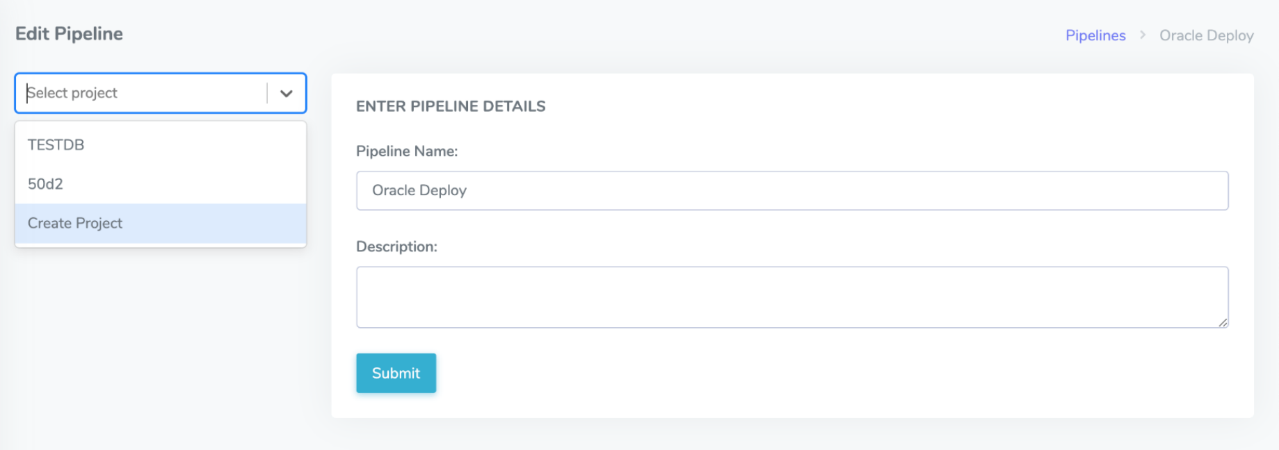 After creating a new pipeline, you can select the Create Project option on the page you are directed to and add the relevant project after the pipeline.