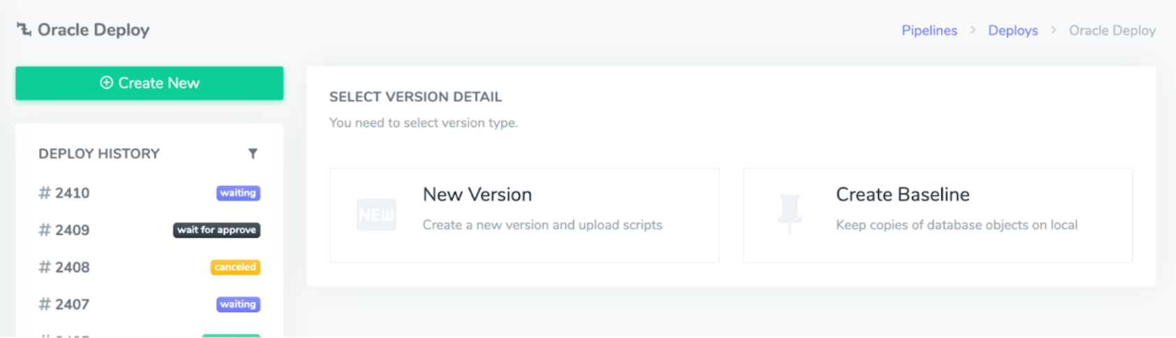 When you click on the Pipeline title and create a new deploy, you can select either New Version or Create Baseline. Selecting New Version will open a page with the steps to upload files to run DDL queries on the database.