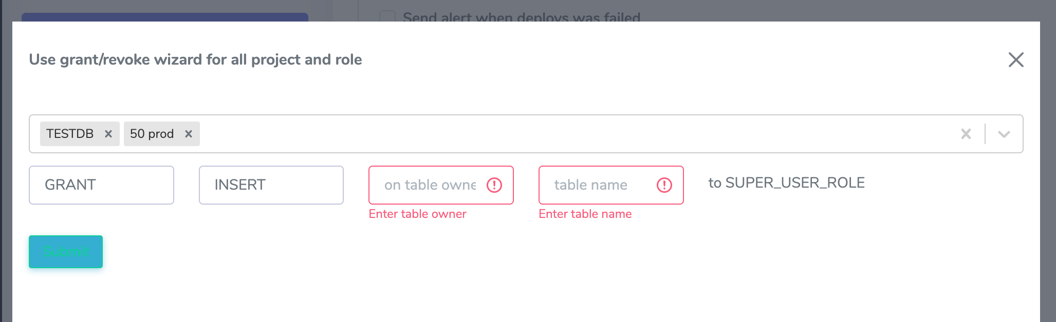 For example, if you want to grant the SUPER_USER_ROLE role INSERT permissions to the TEST table in all databases, you can do so in bulk. After clicking the role you want to grant permissions, click the "Use Grant/Revoke Wizard" button. In the window that opens, select the projects, select the permissions you want to grant to each object, and click the Submit button. Once the process is complete, the SUPER_USER_ROLE role will have INSERT permissions on the TEST table in all databases.