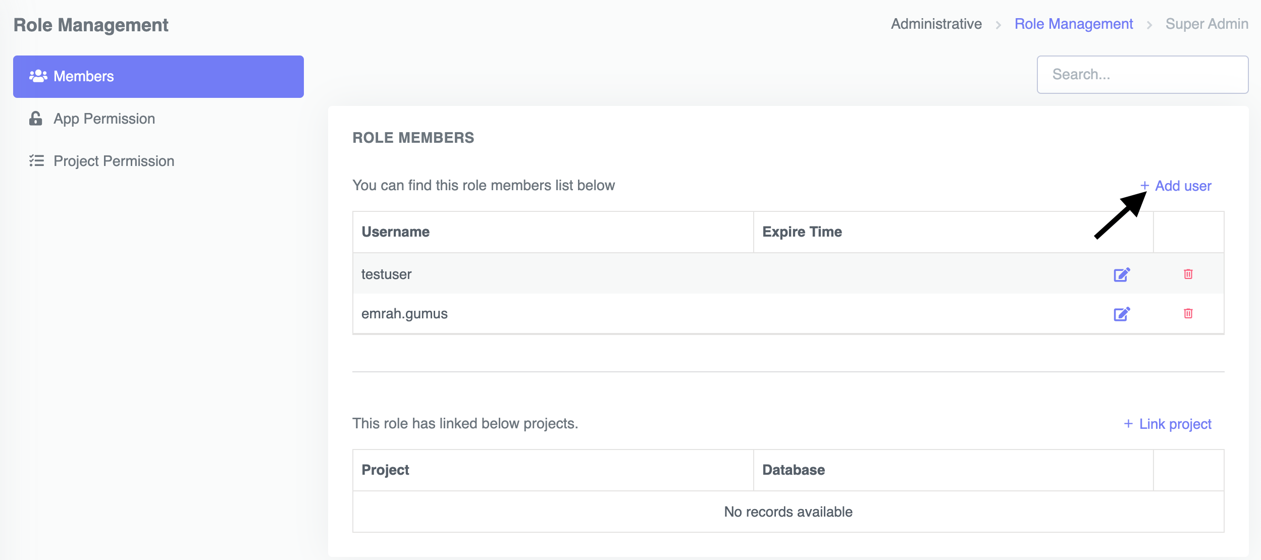 To assign a role to a user for a project, you can edit the relevant project on the Project page and then grant authorization under the User Roles tab.