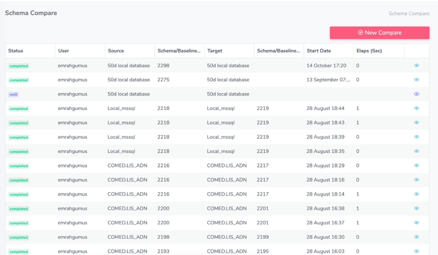 On the Schema Compare page, you can compare the created baselines with each other or access a list of previously compared ones.