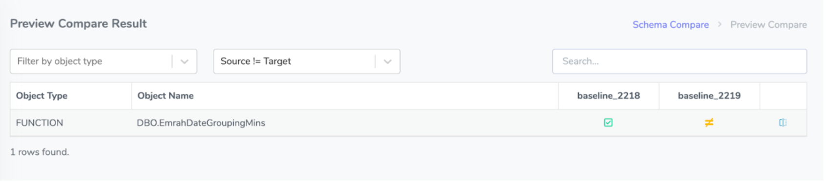 You can click the New Compare button to start a new comparison. You will then be prompted for database and baseline information. You can then begin the comparison and view the changed objects row by row.