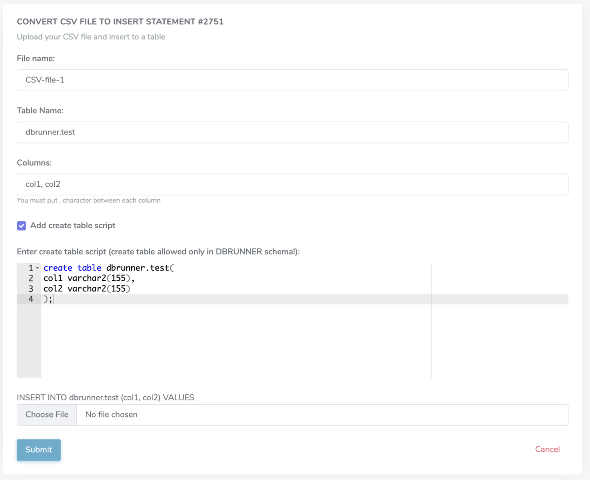 If you are importing into a new table, you must also add the create table query to the relevant form. It's important to note that the create and drop table commands are only allowed under the dbrunner schema. You should edit your code accordingly.