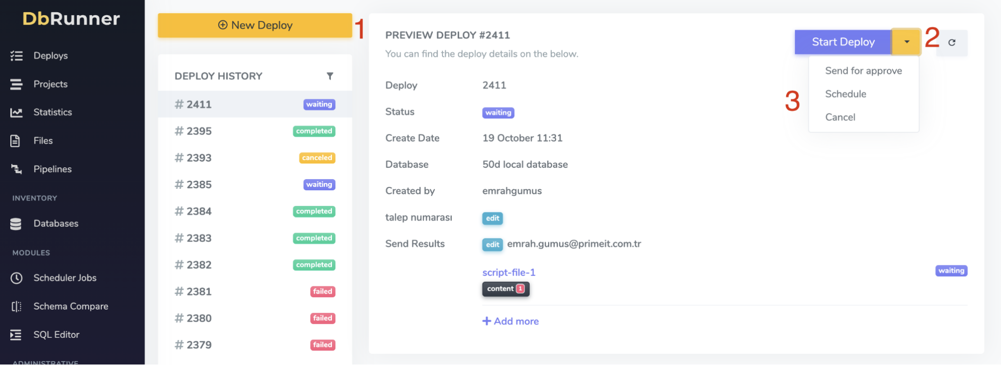After adding a database to the DbRunner application and creating a project for a schema of the database, you can now run DML queries. To do this, click the relevant project on the Project page and click the New Deploy button. A screen like the one below will appear.