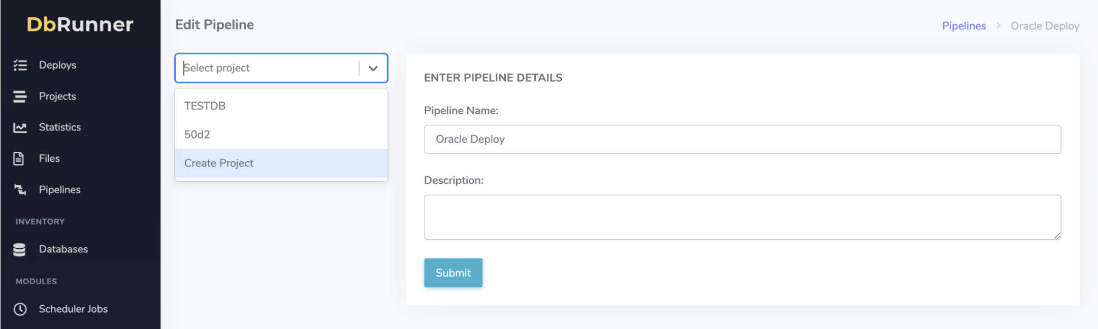 A pipeline must be created to run and version DDL queries via DBRunner. The pipeline created on this page includes the projects on the Project page. The executed DDL queries are deployed to environments sequentially and versioned. Pipeline management is important in this regard. Each pipeline can cover a single project, or it can be created by adding multiple projects sequentially. The baselines to be created are also managed here.