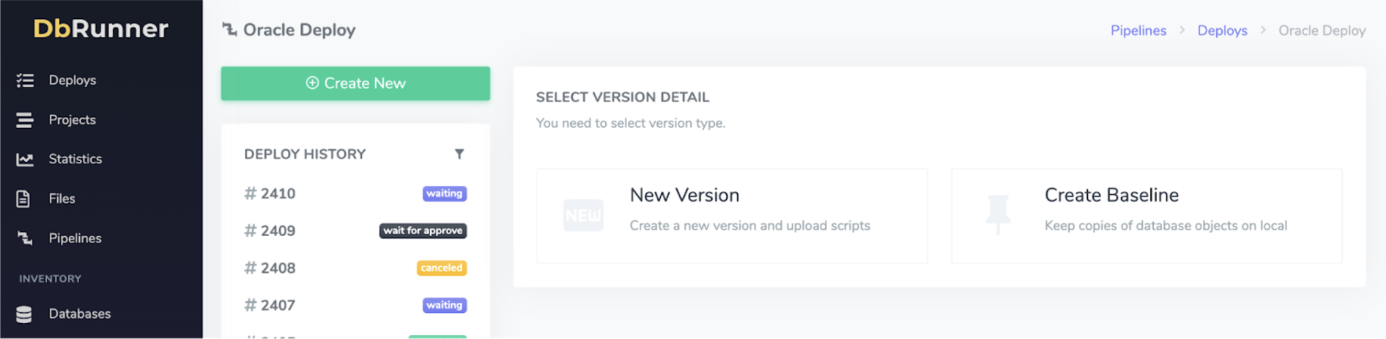 When you click on the Pipeline title and create a new deploy, you can select either New Version or Create Baseline. Selecting New Version will open a page with the steps to upload files to run DDL queries on the database.