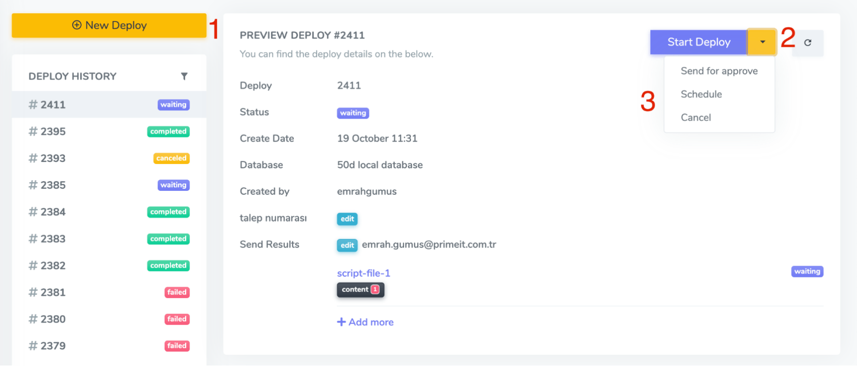 After adding a database to the Executor application and creating a project for a schema of the database, you can now run DML queries. To do this, click the relevant project on the Project page and click the New Deploy button. A screen like the one below will appear.