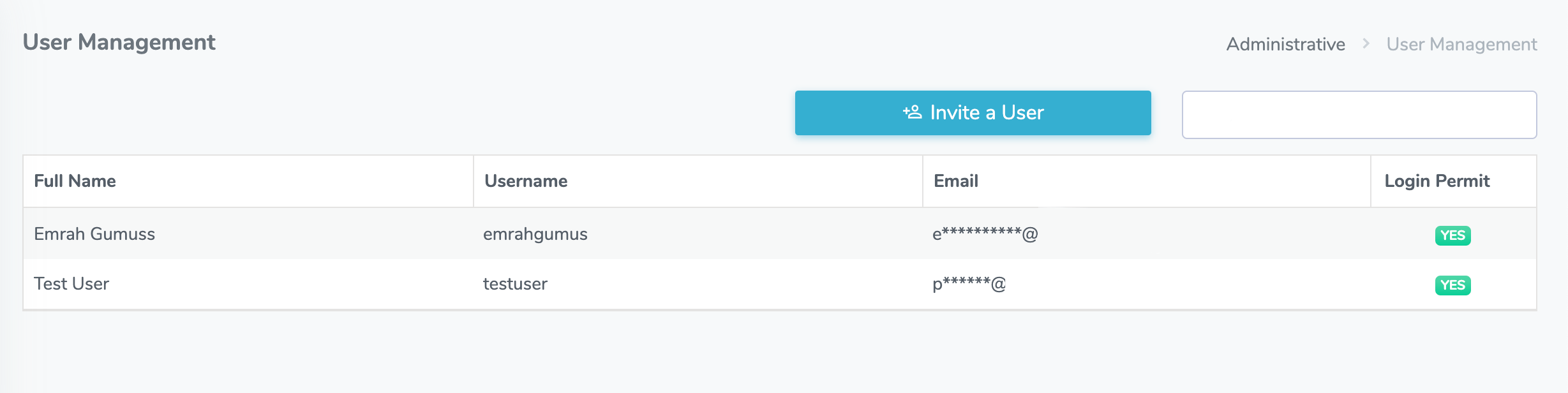 You can access and manage the list of users accessing the Executor application on this page. You can use the Invite User button to add a new user. After adding a new user, an email containing login information will be automatically sent to the user.
