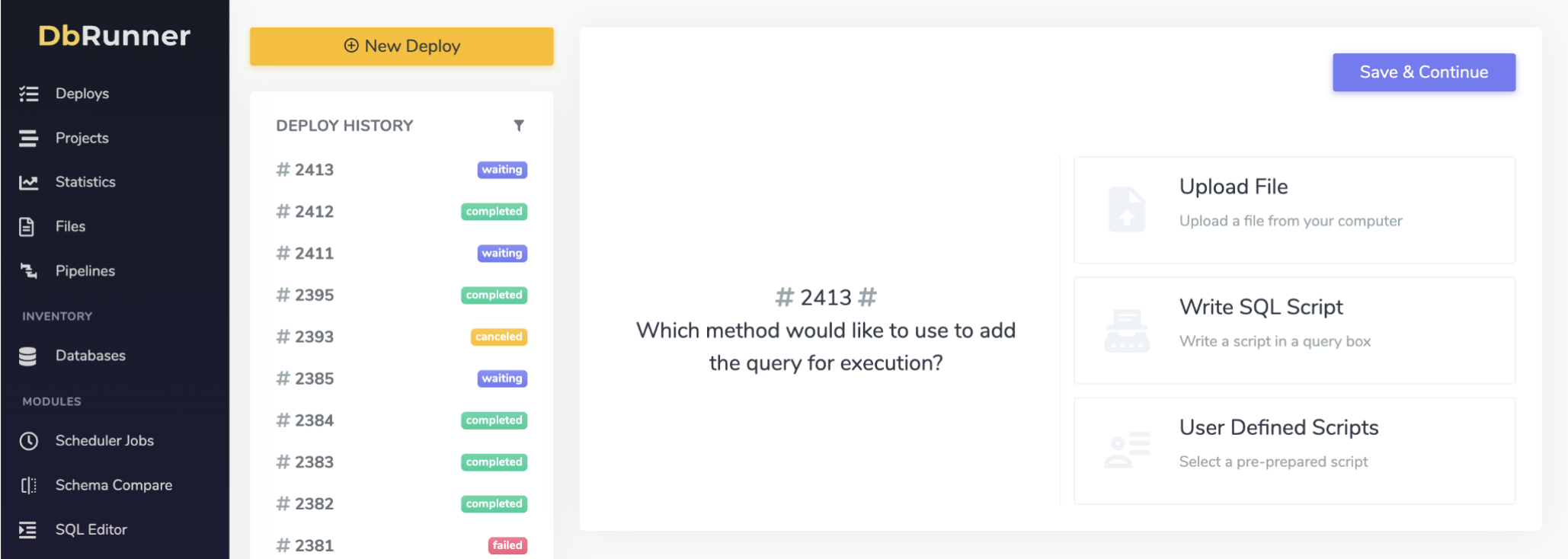 From this page, you can directly upload the queries you want to run, write them using an online text editor, or complete the file upload by selecting one of the predefined scripts. Click the Save & Continue button to access the summary page.
