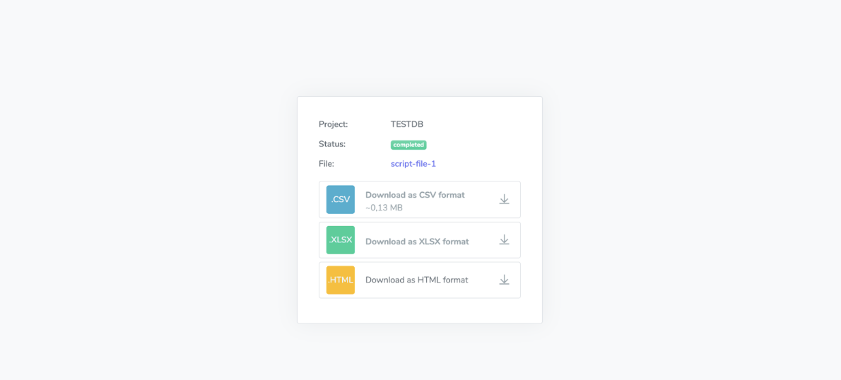 After running the query, you can view the results of the executed query by clicking the result link below the file. If you ran a select query, you can view the output in CSV, XLSX, or HTML format. It's important to note that each file must contain a single select query; otherwise, you'll only be able to access the output in log format.