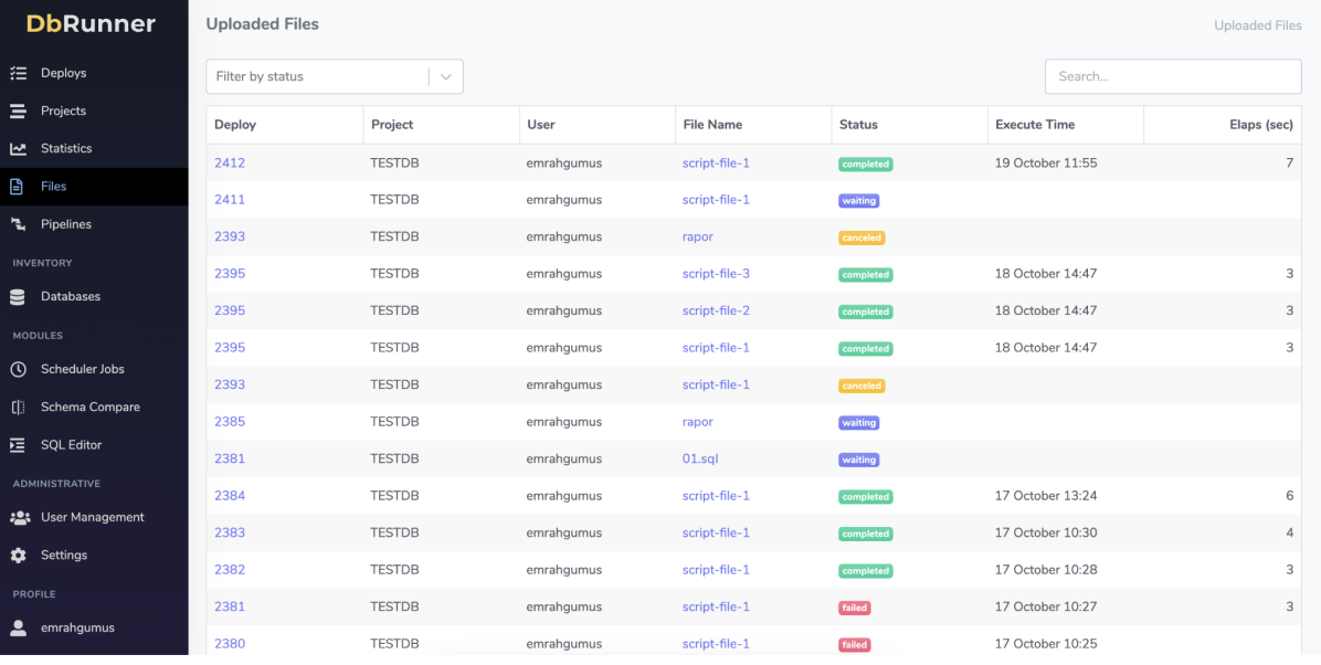 You can access the full list of queries run through DbRunner on the Files page. This page contains statistics, such as which user ran which query. If you want to search for a table within a file, you can do so from this page. For example, typing %DELETE%HR.TEST% in the search box will list the files containing the delete operations performed on the HR.TEST table. % and _ are special characters. They represent the conditions used in the LIKE statement when querying the database.