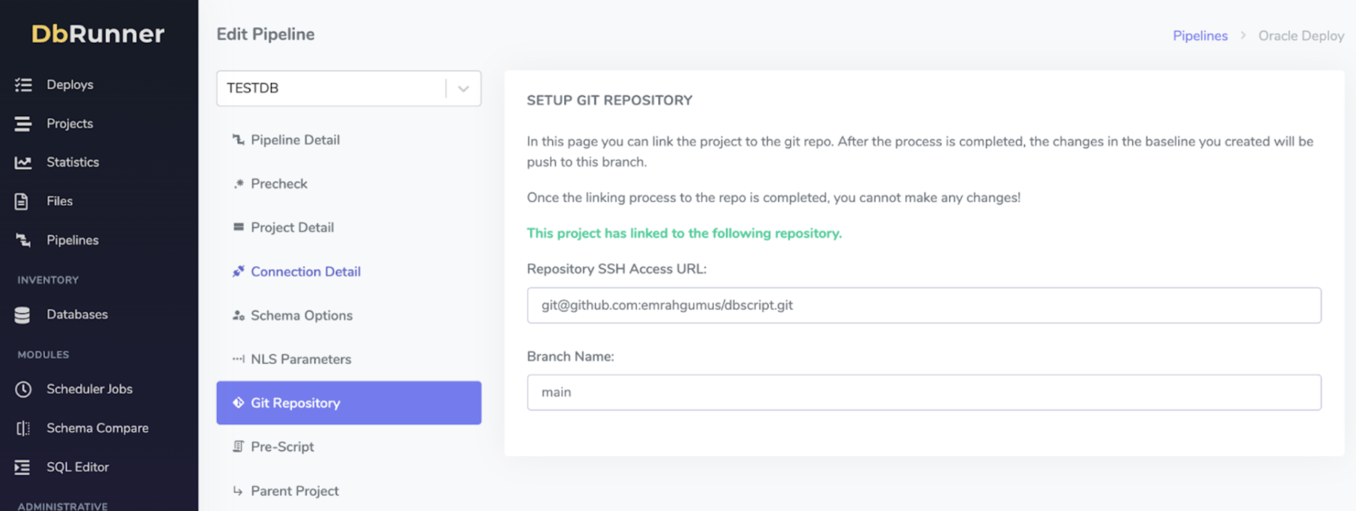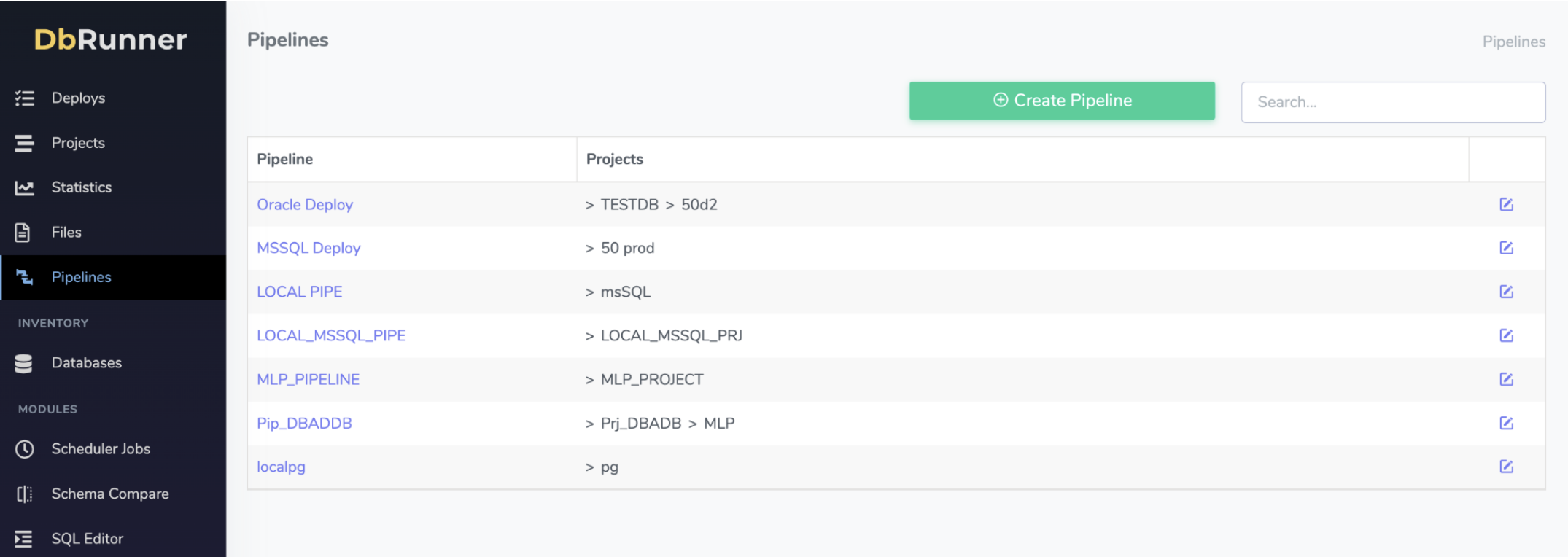 A pipeline must be created to run and version DDL queries via DBRunner. The pipeline created on this page includes the projects on the Project page. The executed DDL queries are deployed to environments sequentially and versioned. Pipeline management is important in this regard. Each pipeline can cover a single project, or it can be created by adding multiple projects sequentially. The baselines to be created are also managed here.