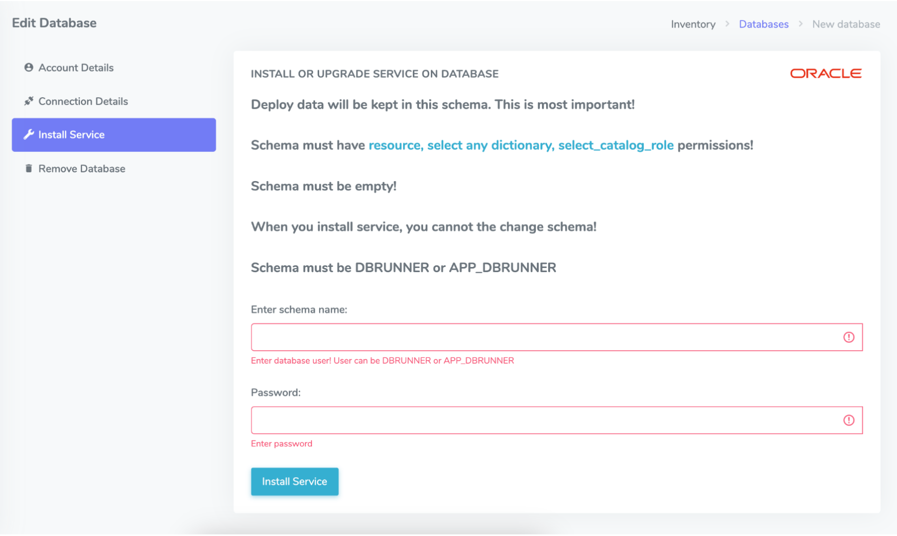 After entering the account and connection information, executor services must be installed on the relevant database from the service install tab for Oracle databases. To do this, go to the Install Service tab and complete the required fields before completing the process. You cannot perform DDL deployments or create a baseline without doing this.