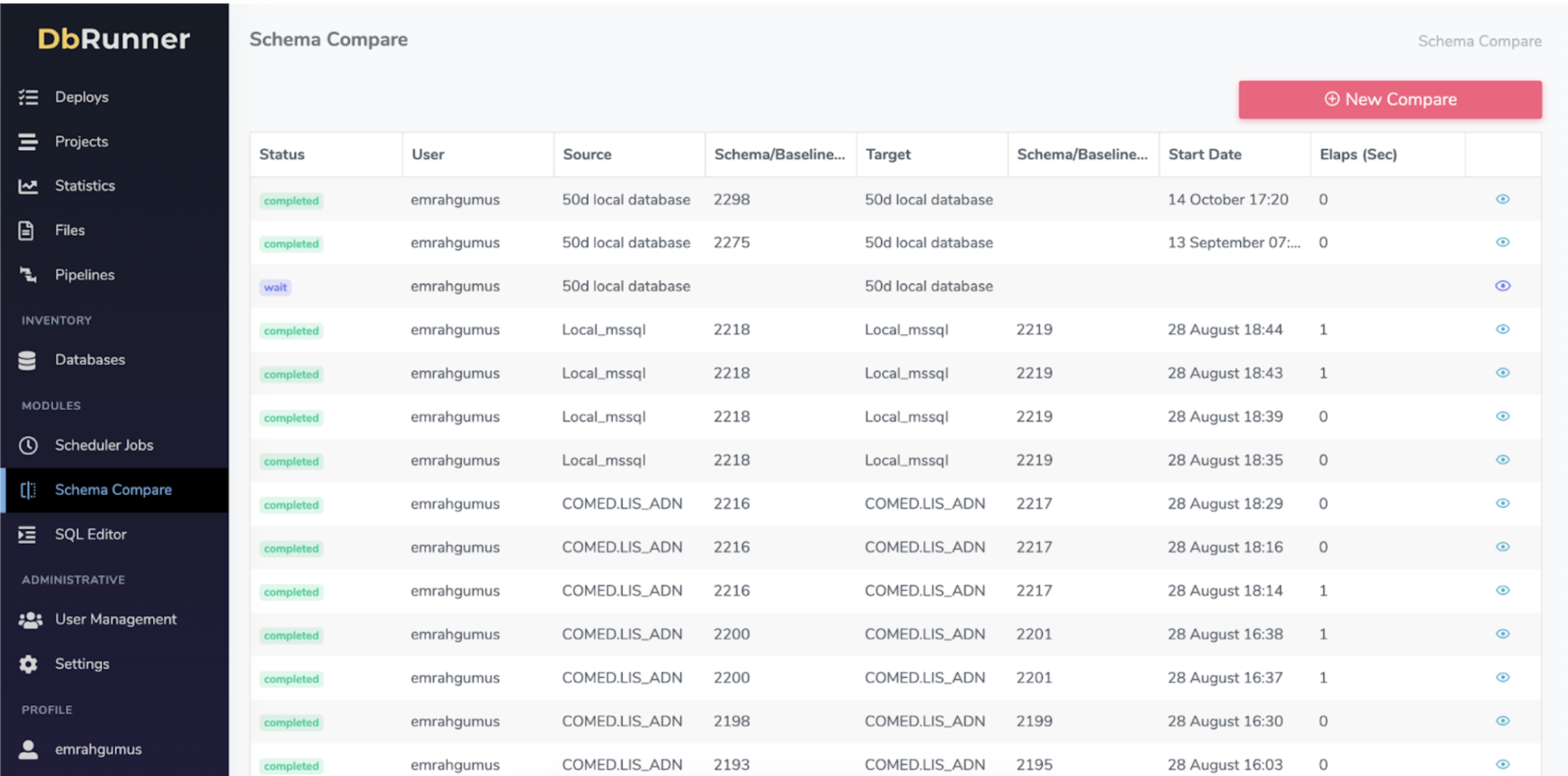 On the Schema Compare page, you can compare the created baselines with each other or access a list of previously compared ones.