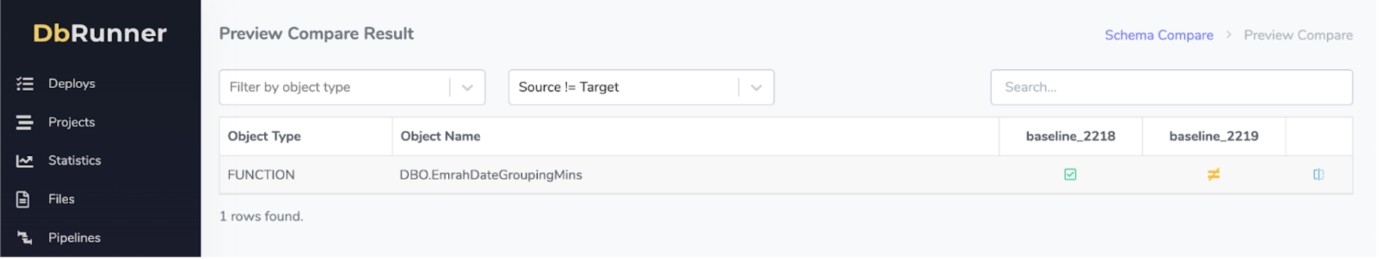 You can click the New Compare button to start a new comparison. You will then be prompted for database and baseline information. You can then begin the comparison and view the changed objects row by row.